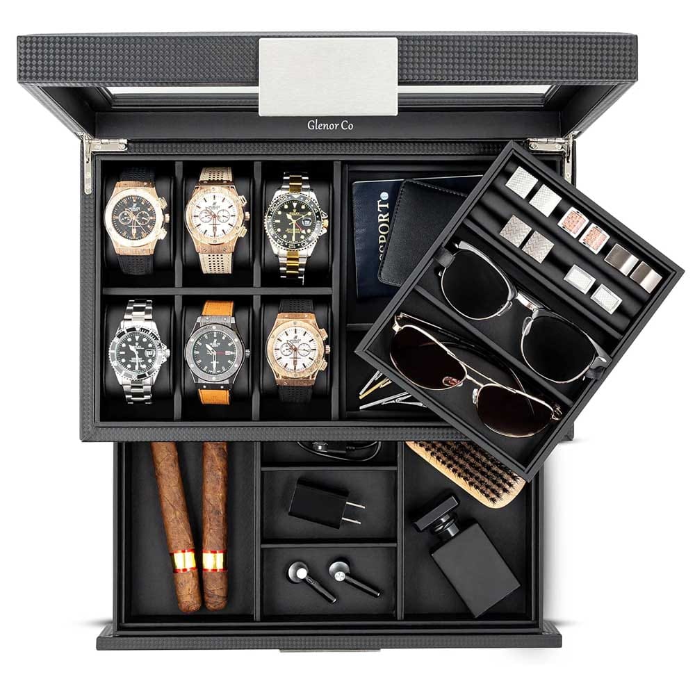 This handsome box features space for six large watches, twelve cufflinks, two pairs of sunglasses, and three hidden compartments for special treasures. Whether it’s everyday accessories or sentimental keepsakes, there’s a place for everything... and everything in its place.