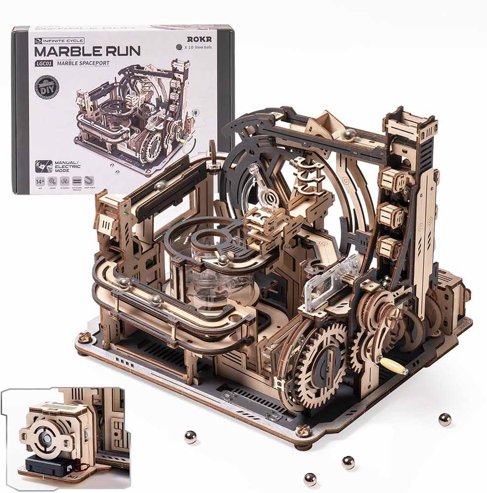 With 472 laser-cut pieces made from wood and acrylic, it’s like LEGO for grown-ups, but with gears, pulleys, a spiral track, and even manual and electric modes. Once built, it becomes a fully functional marble run that’s mesmerizing to watch and seriously impressive to show off.